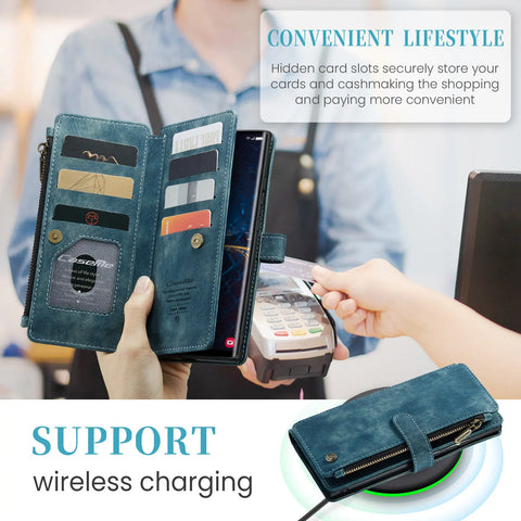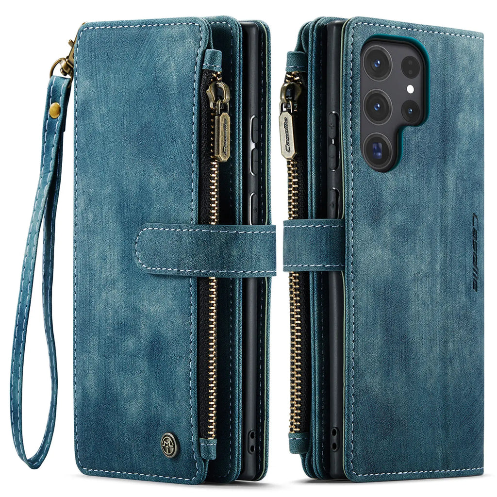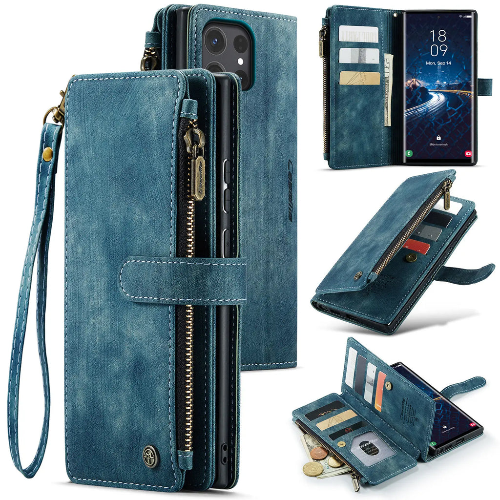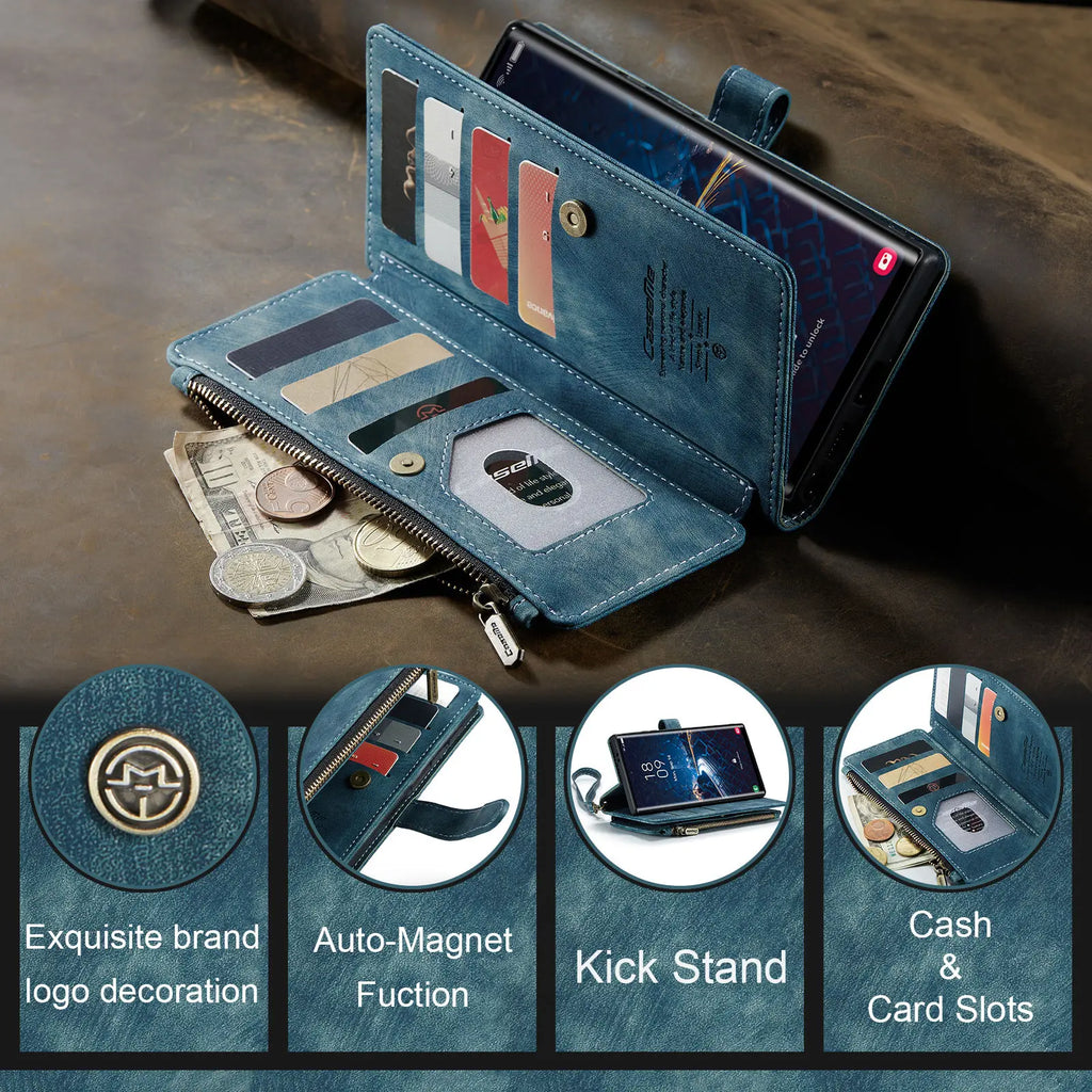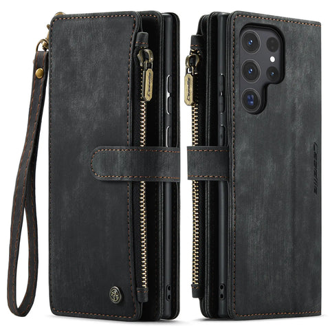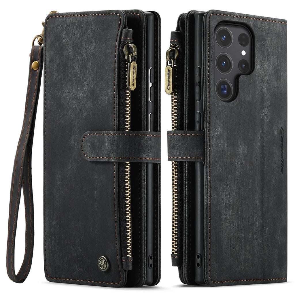 This Retro Leather Wallet Case for Samsung combines durability with functionality. Crafted from robust PU leather, it offers reliable protection while featuring a magnetic flip closure for convenient access. The integrated strap wristlet enhances portability, and the secure zipper compartment keeps your cards organized and safe, making it an ideal accessory for efficient, hands-free daily use.